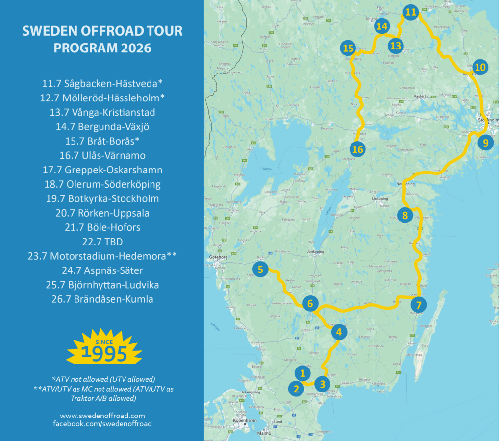 Join 16 days of offroad adventure across 16 amazing locations in southern Sweden. Pay per vehicle and hop in anytime — enjoy a pay-and-play experience day by day, no pre-registration needed.